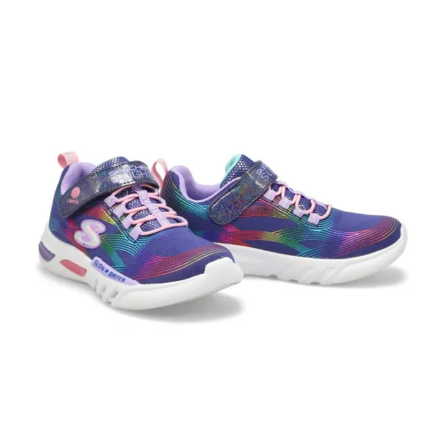 Make your day bright with every step in the Glow-Brites Lighted navy/ multi sneaker from Skechers. This bungee-laced slip-on light-up design features a mesh upper with metallic rainbow trim and a light-up midsole. Breathable athletic mesh upper with metallic rainbow trim. Hook and loop strap with on/off light switch. Flexible nonmarking traction outsole.