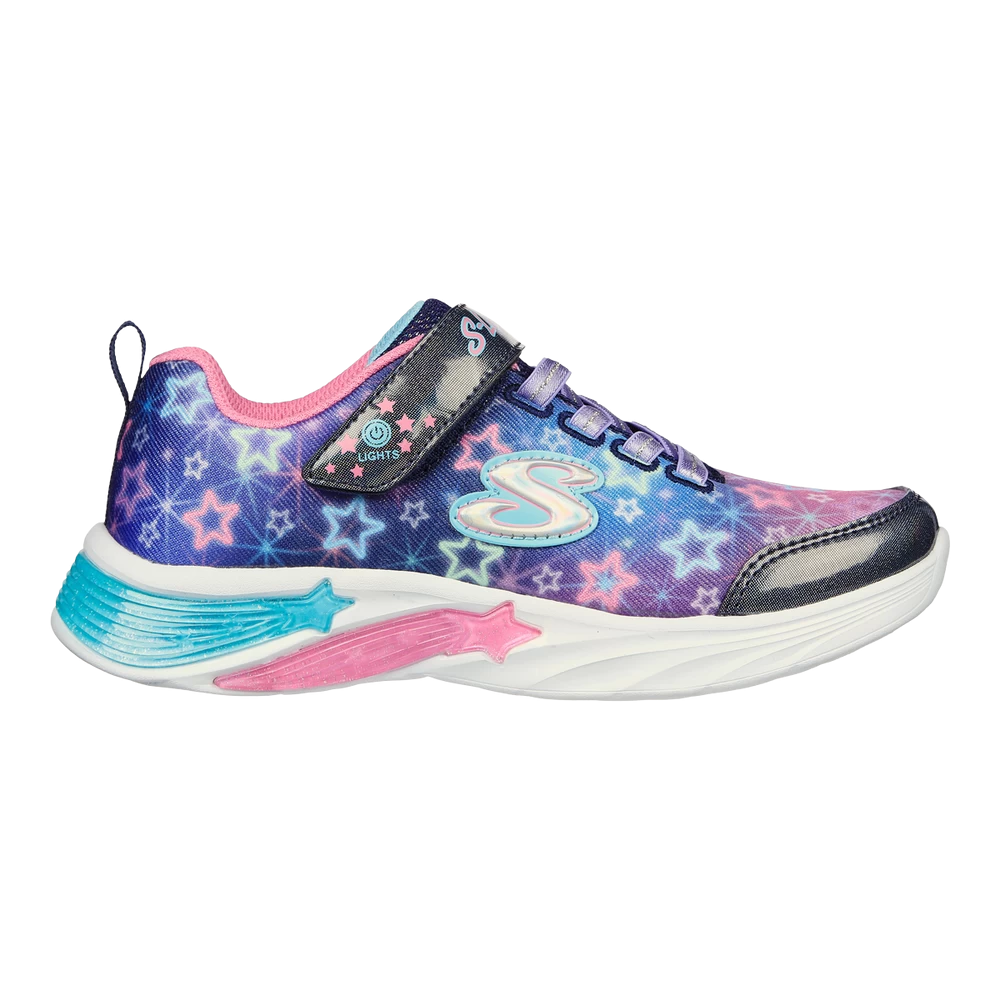 Light-up your steps in superstar style with Skechers S-Lights®: Star Sparks. This sporty light-up design features a sparkle star print fabric and synthetic upper with stretch laces.