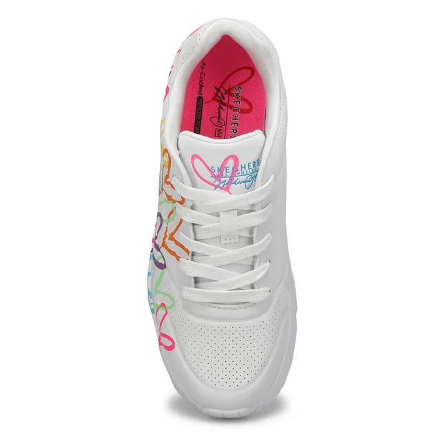 Internationally renowned muralist James Goldcrown brings his iconic #Lovewall heart designs to Skechers in this inspiring collaboration. Show your creative style with the Skechers x JGoldcrown: Skechers Street Uno Sread the Love. This lace-up fashion sneaker features a print of the artists signature heart design that extends to the outsole, synthetic durabuck and perforated trimmed upper with a Skechers Air-Cooled Memory Foam insole, plus a platform wedge midsole.