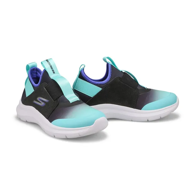 Move with an extra step of comfort wearing the Skech Fast Ombre Sunset black /aqua sneaker from Skechers. This lightweight sporty design features an ombre mesh and synthetic upper with a cushioned comfort insole. Shock-absorbing midsole for all day comfort. Flexible traction outsole. Lightweight laceless style with elasticized quarter brace.
