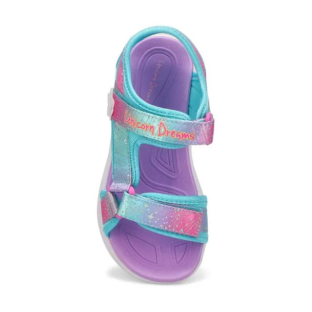 Brighten up your day with a little unicorn magic wearing Skechers S-Lights: Unicorn Dreams Sandals in pink multi. This light-up sandal features an ombre satin fabric and mesh upper with a cushioned comfort insole. With two adjustable hook and loop straps, and a cushioned comfort foorbed, these sandals are perfect for any play ground.