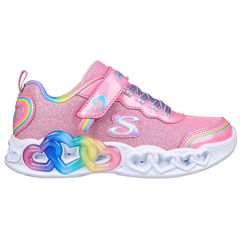 Sparkle and shine in magical delight wearing Skechers Heart Lights® Infinite Heart Lights – Love Prism. This light-up design features a sparkle mesh upper with synthetic glitter overlays, an adjustable instep strap closure, and a sculpted light up midsole with ‘heart chain’ detail.