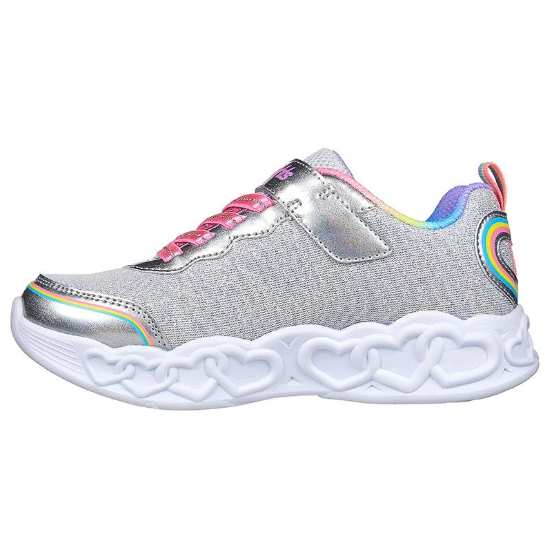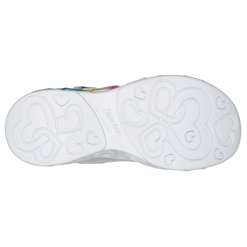 Sparkle and shine in magical delight wearing Skechers Heart Lights® Infinite Heart Lights – Love Prism. This light-up design features a sparkle mesh upper with synthetic glitter overlays, an adjustable instep strap closure, and a sculpted light up midsole with ‘heart chain’ detail.