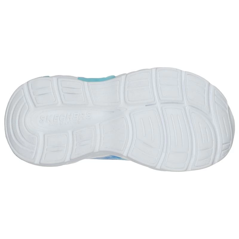 Give her the full spectrum of sporty style and light-up fun with the Skechers S Lights: Rainbow Racers shoe. Athletic mesh fabric and smooth glitter finish synthetic upper in a slip on bungee laced light up sporty sneaker with multi color rainbow-shaped detail light up midsole.