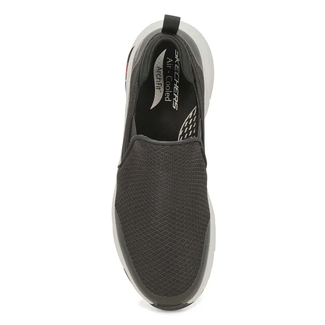 Your feet will thank you for the supportive comfort and sporty style of the Arch Fit Banlin black/ white slip on sneakers from Skechers. Athletic woven mesh fabric and smooth synthetic upper in a slip on sporty casual comfort walking sneaker with Arch Fit removable supportive cushioning insole system and cushioned midsole.
