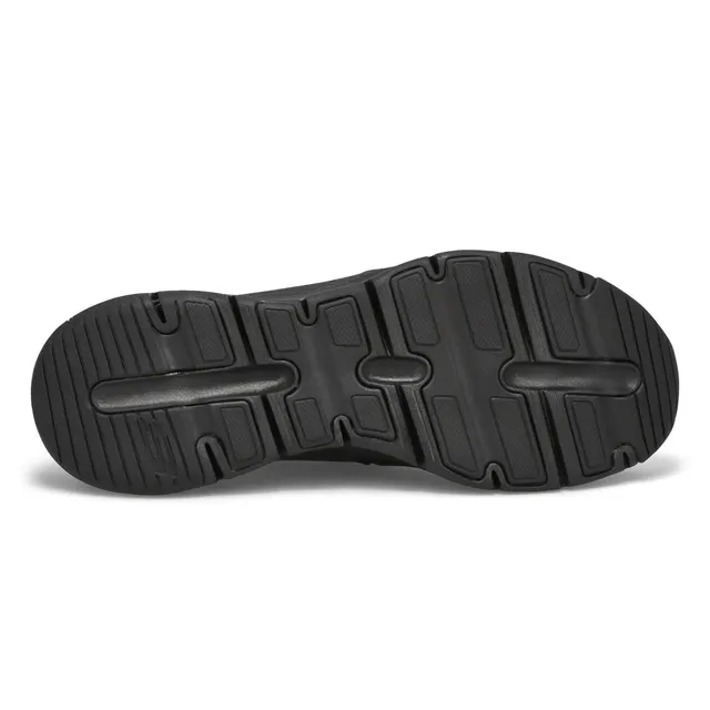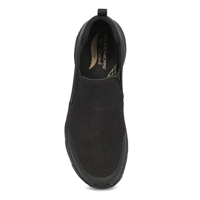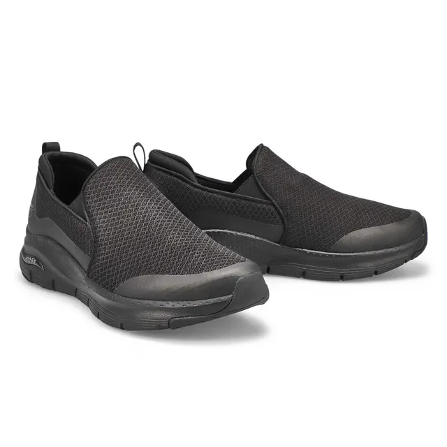 Your feet will thank you for the supportive comfort and sporty style of the Arch Fit Banlin black/ black slip on sneakers from Skechers. Athletic woven mesh fabric and smooth synthetic upper in a slip on sporty casual comfort walking sneaker with Arch Fit removable supportive cushioning insole system and cushioned midsole.