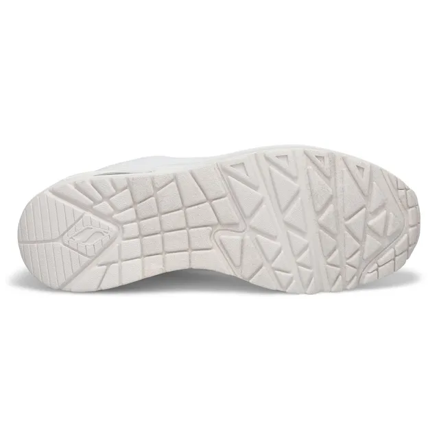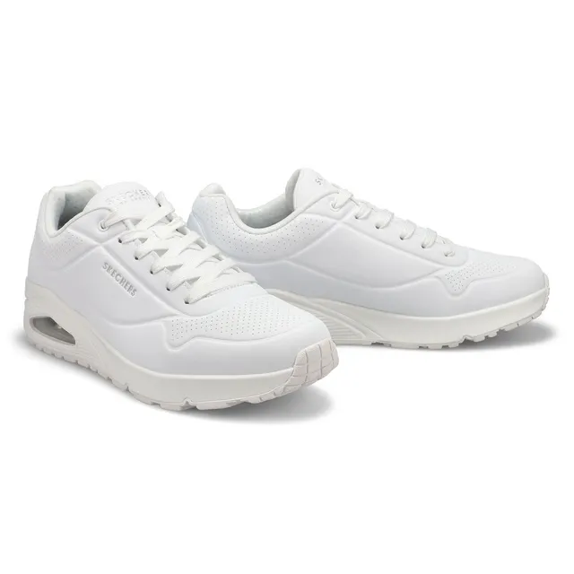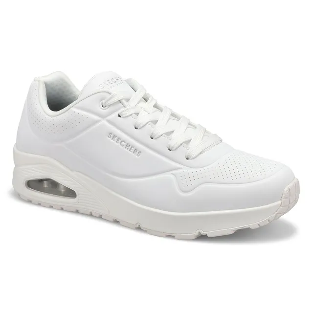 Classic air cushioned style meets updated comfort in the Uno Stand On Air white/ white fashion sneaker from Skechers. Smooth leather-textured synthetic upper in a lace up classic fashion sneaker with stitching and perforation accents. Air Cooled Memory Foam insole, visible air cushioned midsole. Padded collar and tongue for added comfort. Classic style midsole with embossed texture detail.