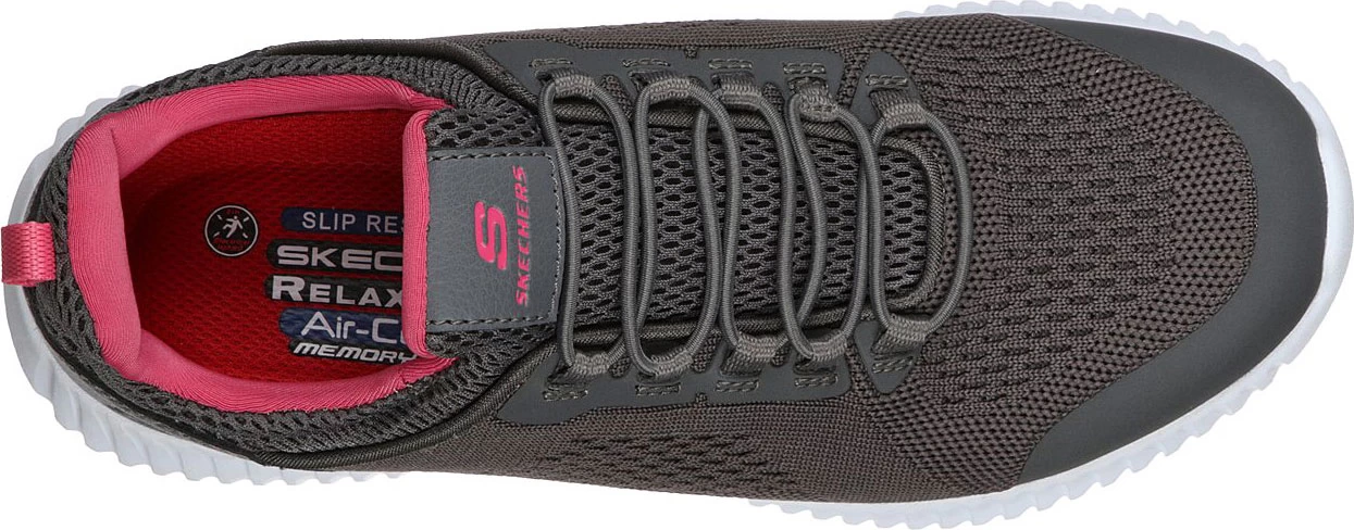 Woven, mesh fabric upper with water and stain resistant treatment. Stretch bungee laced front. Soft fabric lining. Memory foam full length, cushion footbed. Relaxed Fit design. Lightweight, shock absorbing midsole.Slip resistant rubber outsole. ASTM EH compliant. Soft toe. No safety toe cap.