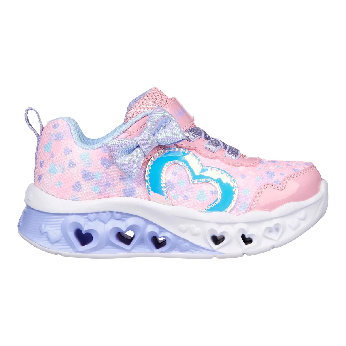 Brighten your steps with heart-filled style wearing Skechers Flutter Heart Lights – Kind Spirit. This lightweight pull-on features a heart print fabric upper with synthetic glitter heart overlay and a fun 3-D heart-sculpted light-up midsole.