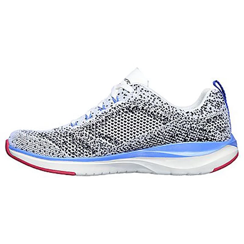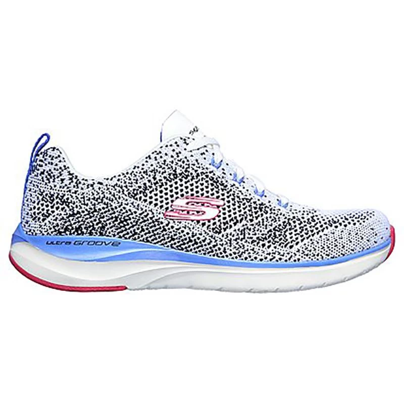 Get into the habit of looking great and feeling the cushioned comfort of the SKECHERS Ultra Groove shoe. Soft woven flat knit mesh fabric upper in a lace up sporty comfort training sneaker with shock absorbing Ultra Groove midsole and Air-Cooled Memory Foam insole.