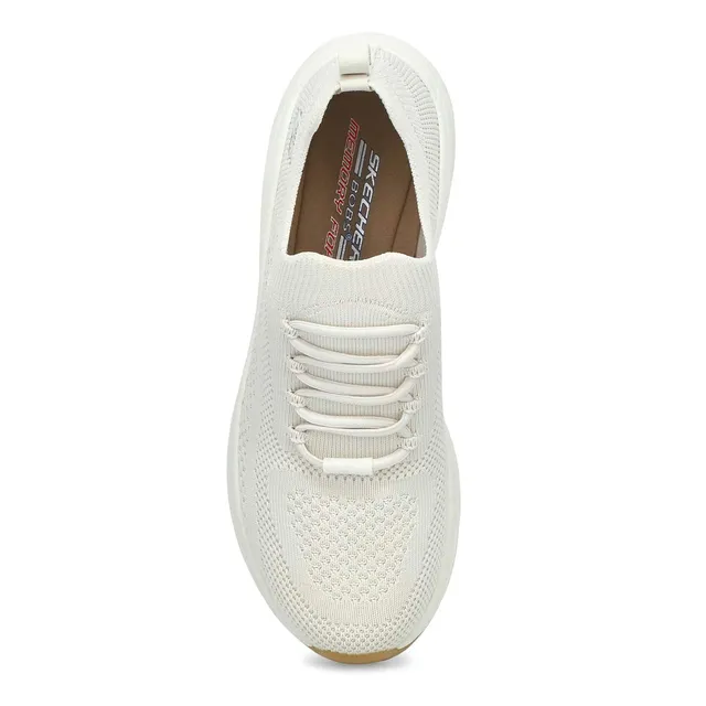 Pledge to show off more style and comfort with the Bobs Sport Sparrow 2.0 white shoe from Skechers. Soft woven engineered knit mesh fabric upper in a slip on stretch laced sporty casual sneaker with fashionable monochromatic design and Memory Foam insole. Matching color stretch bungee front panel for easy slip on fit. Socklike fit at collar with soft textured knit.