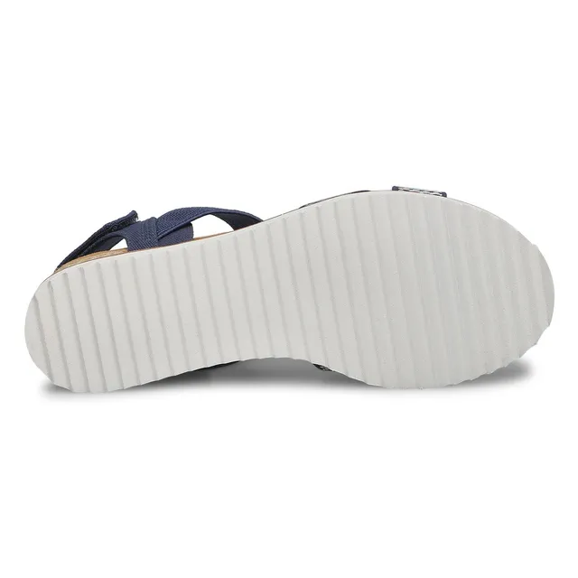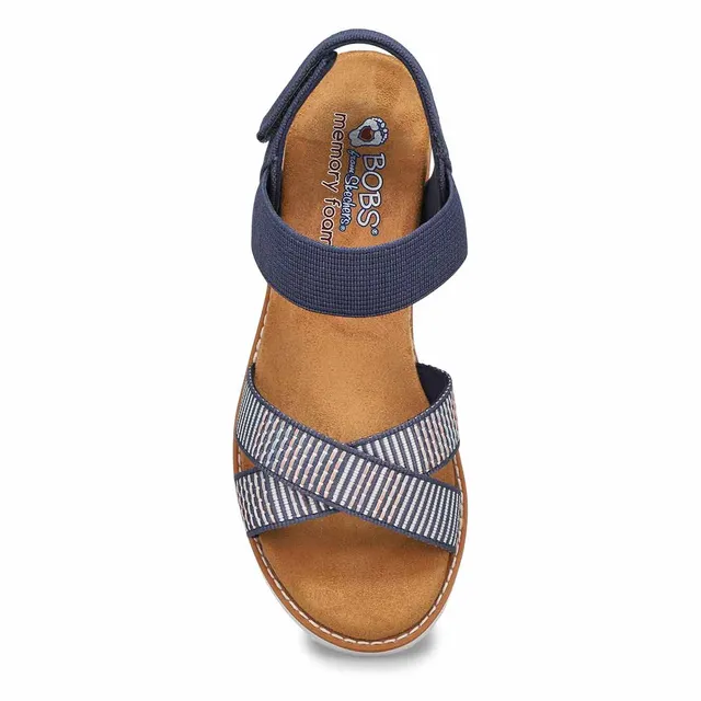 Chill out your style with comfort in hot weather in the Desert Kiss navy/ multi casual sandal from Skechers. Features a soft smooth durasuede textured synthetic upper with a strappy casual comfort sandal design. Side crossing ankle sling strap with adjustable heel strap. Smooth fabric strap lining with a memory Foam cushioned & contoured comfort footbed for all day comfort.