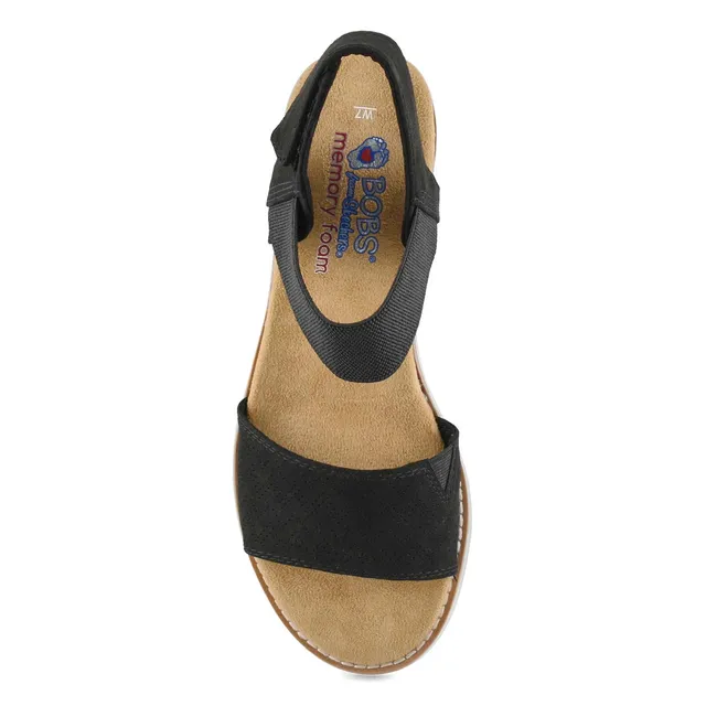 Chill out your style with comfort in hot weather in the Desert Kiss black casual sandal from Skechers. Features a soft smooth durasuede textured synthetic upper with a strappy casual comfort sandal design. Side crossing ankle sling strap with adjustable heel strap. Smooth fabric strap lining with a memory Foam cushioned & contoured comfort footbed for all day comfort.