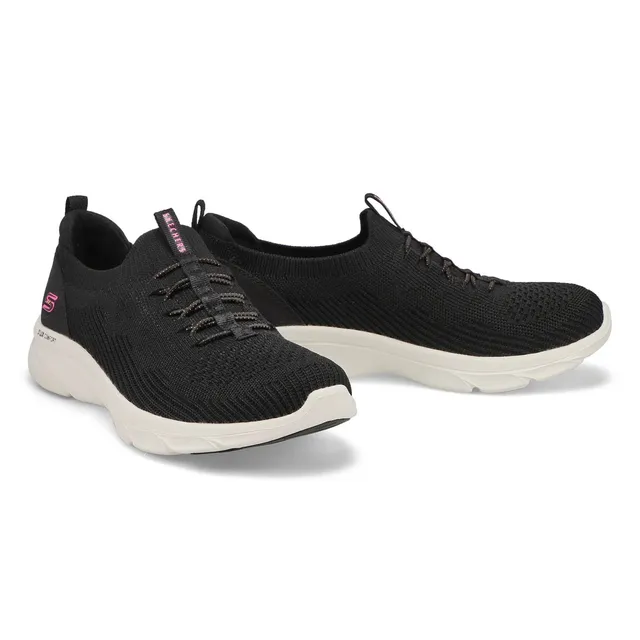 Enjoy a luxurious feel and sporty style with the Skechers DLux Comfort slip on sneaker in black. This slip-on features a soft knit and synthetic upper with stretch laces, Skechers Air-Cooled Memory Foam® insole and a well-cushioned DLux Comfort midsole. This versitile sneaker can be machine washed when needed, and features a Flexible traction outsole.