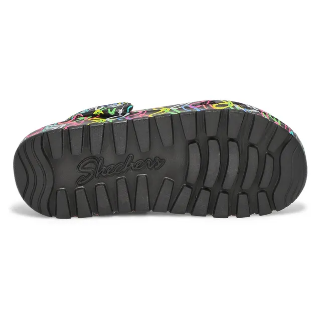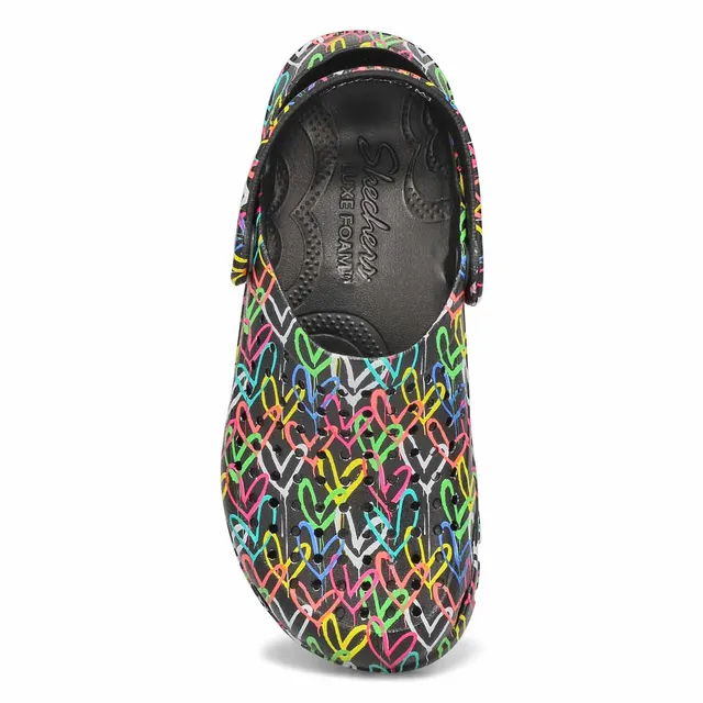 Brighten your spirits with a fun-day at the beach or pool wearing theJGoldcrown Footsteps black/ multi clog from Skechers. These water-friendly clogs feature a sculpted Foamies EVA lightweight flexible upper with colorful heart prints designed by famous muralist James Goldcrown, round toe, slip-on fit with slingback strap, Luxe-foam contoured footbed for comfort, shock-absorbing midsole and flexible traction outsole.