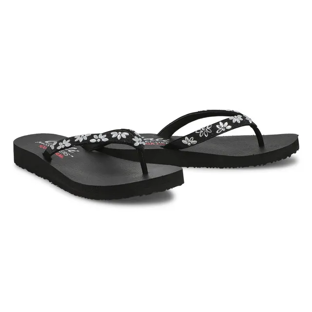 Get a top score fur sunny sparkle with the Meditation Love Letter black thong flip flop from Skechers. Smooth textured synthetic upper in a low profile fashion thong sandal design with accents. Yoga Foam comfort footbed. You will want to make the Meditation thong flip flop part of your must-have list for this season!
