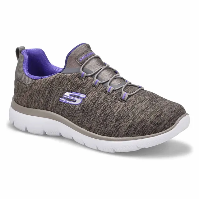 Get right to the sporty style and comfort wearing the Quick Getaway charcoal/ purple slip on from Skechers. Features a Jersey knit mesh nearly one piece upper in a Nearly seamless upper design. Slip on bungee front athletic training sneaker design. Soft fabric shoe lining with a Memory Foam full length cushioned comfort insole for all day comfort.