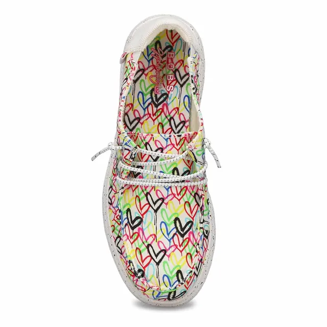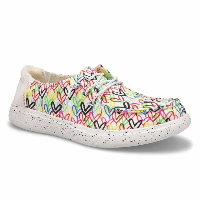 Internationally renowned muralist James Goldcrown brings his iconic #Lovewall heart designs to Skechers in this inspiring collaboration. This slip-on casual boat styled wallabee style oxford features a soft canvas upper with decorative laces and cushioned Memory Foam insole. Skechers Memory Foam cushioned comfort insole. The Bobs Skipper Goldcrown is designed with a flexible rubber traction outsole.