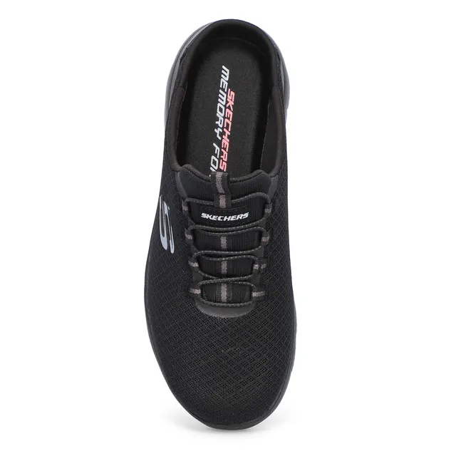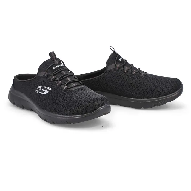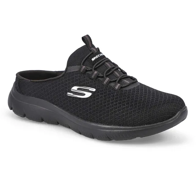 Enjoy the fresh air in supportive feet-loving comfort with the Skechers Summits Open Back black sneaker. This open-back sneaker features a heathered jersey mesh upper with a bungee-laced front and Memory Foam cushioned insole. The Summits open back sneaker is designed with a shock-absorbing midsole and flexible rubber traction outsole.