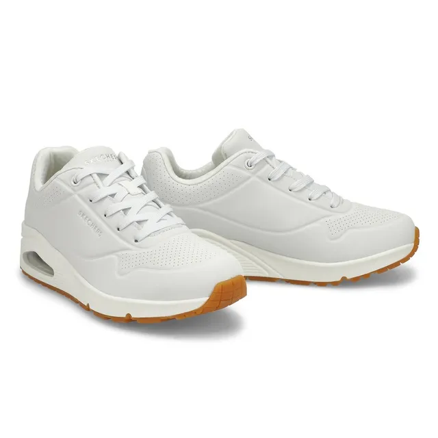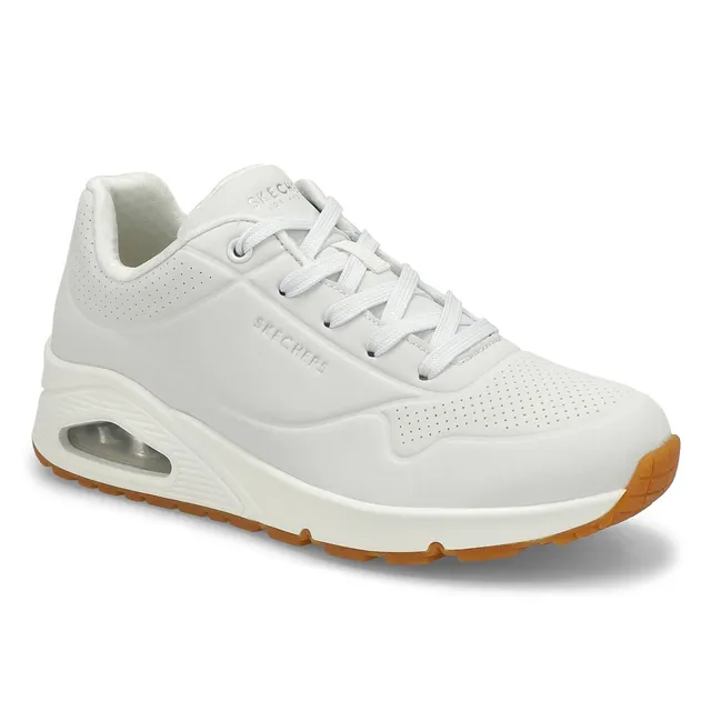 Classic air cushioned style meets updated comfort in the Uno Stand On Air white fashion sneaker from Skechers. Smooth leather-textured synthetic upper in a lace up classic fashion sneaker with stitching and perforation accents. Air Cooled Memory Foam insole, visible air cushioned midsole. Padded collar and tongue for added comfort. Classic style midsole with embossed texture detail.