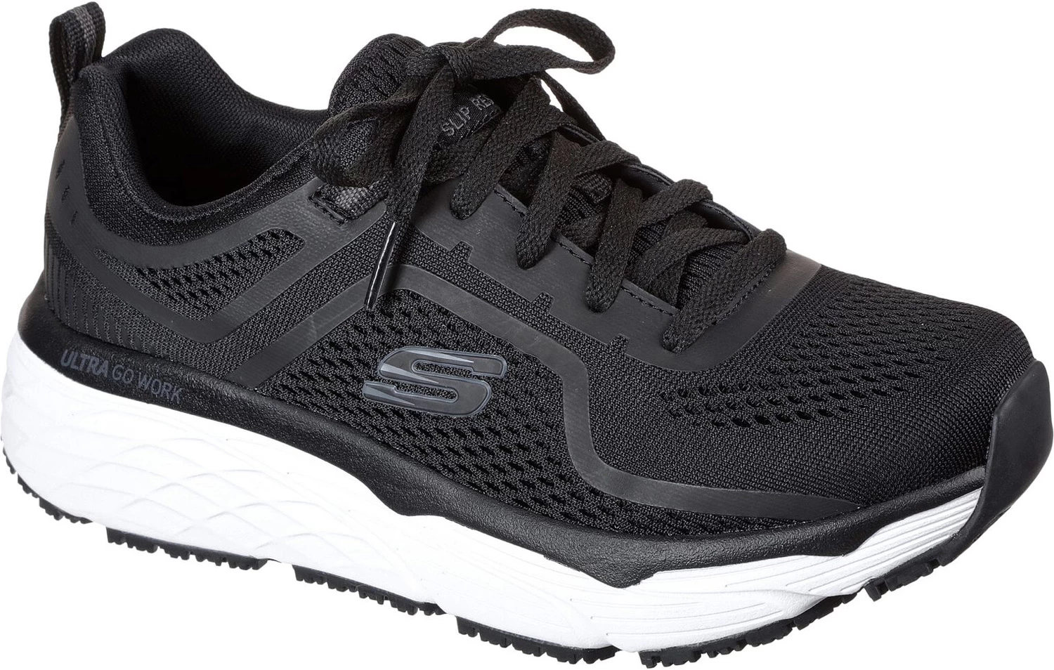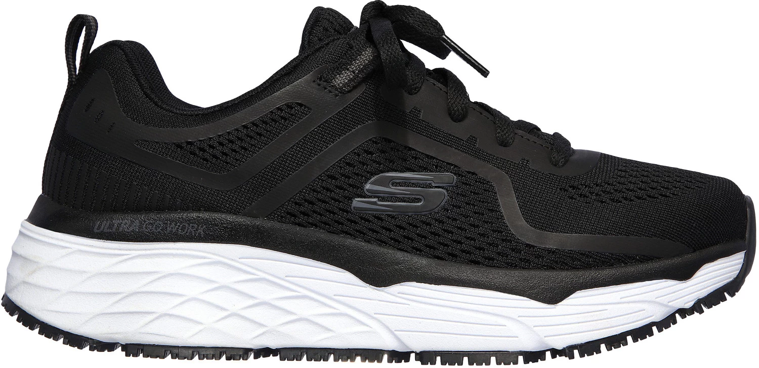 Breathable mesh knit upper. Aircooled memory foam cushioned footbed. Max Cushioning Elite design. ULTRA GO Work cushioning platform for shock absorption. Oil and slip resistant rubber outsole. Soft toe. No safety toe cap. Machine washable.