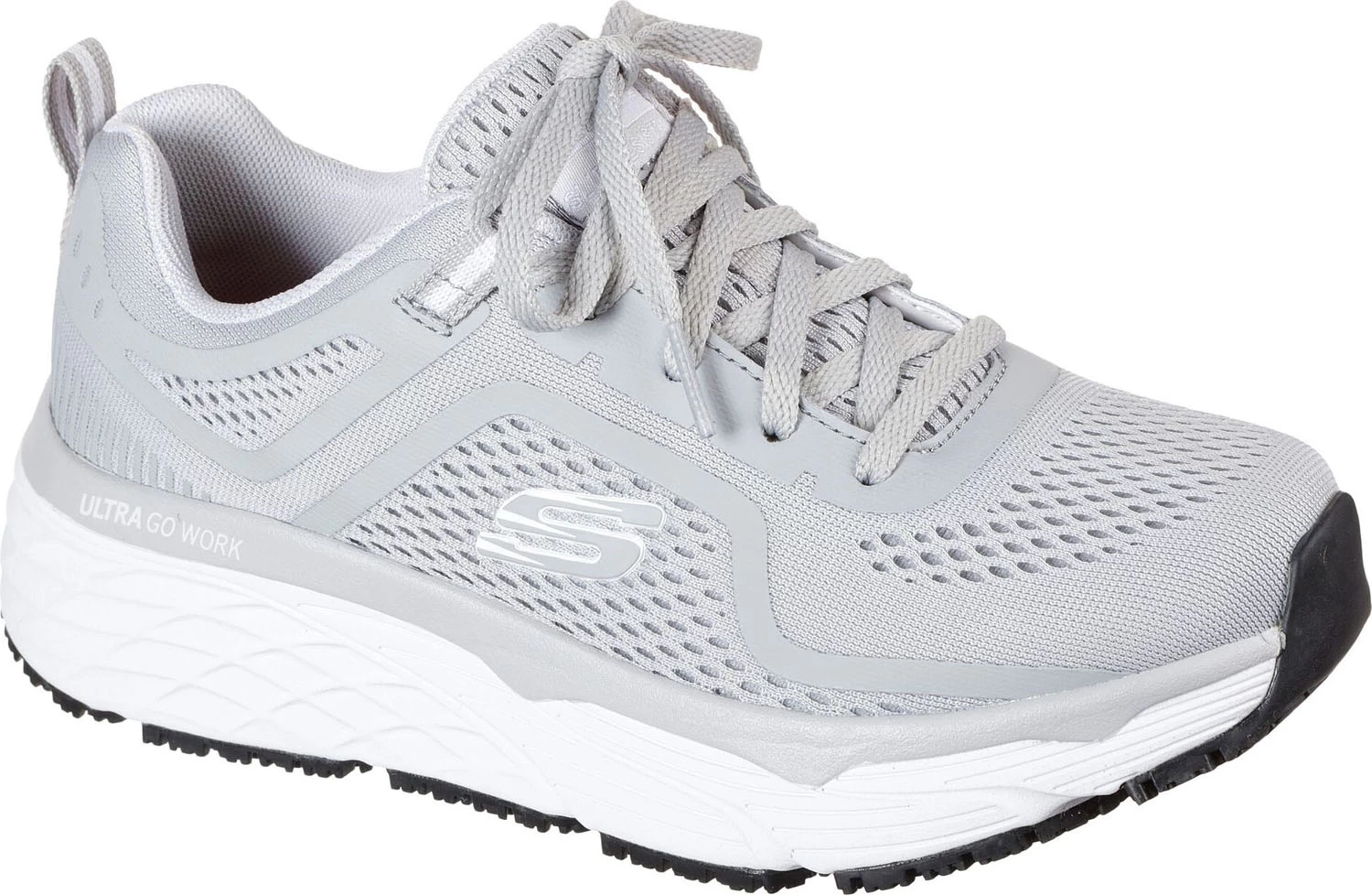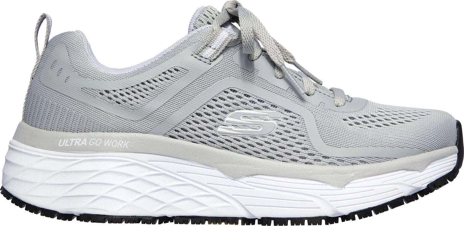 Breathable mesh knit upper. Aircooled memory foam cushioned footbed. Max Cushioning Elite design. ULTRA GO Work cushioning platform for shock absorption. Oil and slip resistant rubber outsole. Soft toe. No safety toe cap. Machine washable.