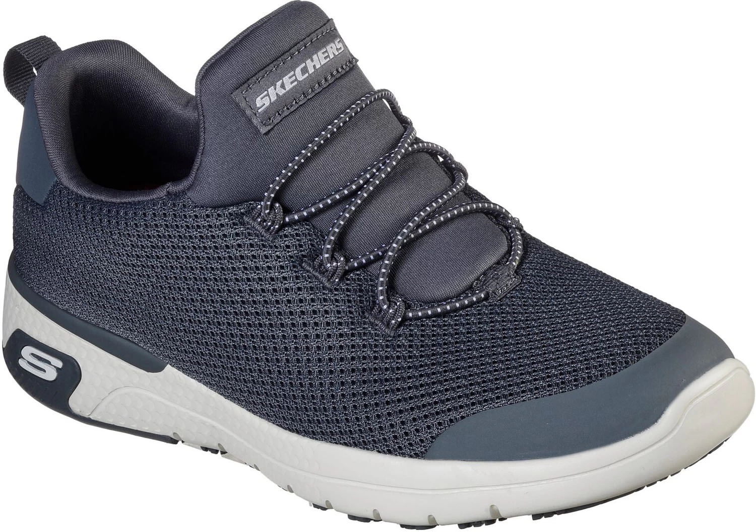 Water and stain repellent knit mesh fabric upper with synthetic overlays at toe and heel. Stretch lace closure. Relaxed Fit design. Soft fabric lining. Memory foam footbed. Shock absorbing midsole. Slip resistant rubber outsole. Soft toe. No safety toe cap.